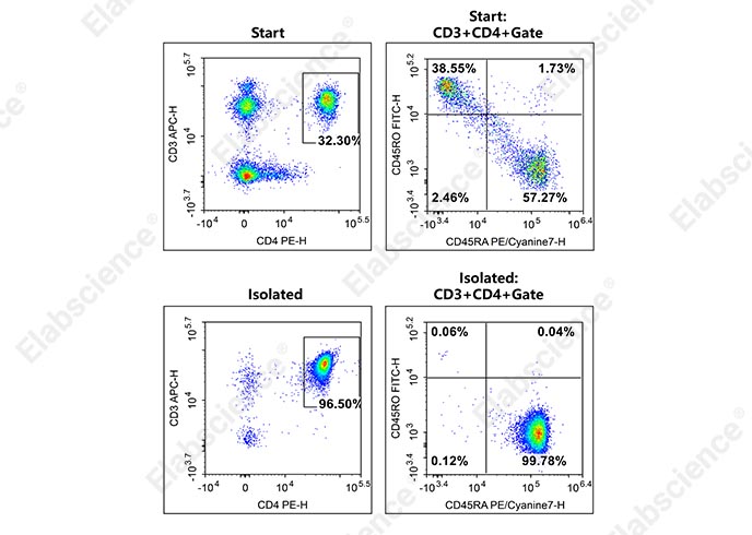 分选后可通过流式细胞术验证纯度,使用 APC Anti-Human CD3 Antibody [OKT-3]、PE Anti-Human CD4 Antibody [RPA-T4]、FITC Anti-Human CD45RO Antibody [UCHL1] 及 PE/Cyanine7 Anti-Human CD45RA Antibody [HI100] 组合标记,精准识别初始 CD4⁺T 细胞(CD3⁺CD4⁺CD45RA⁺CD45RO⁻),确保分选效果可量化验证。
