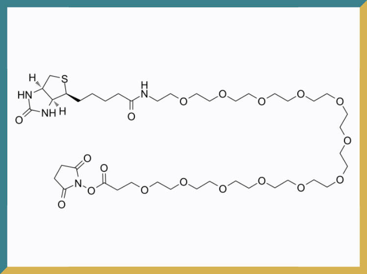 Biotin-PEG12-NHS ester是一种常用的生物标记与连接试剂,由生物素(Biotin)、12单元聚乙二醇(PEG12) 以及N-羟基琥珀酰亚胺酯(NHS ester) 三部分构成。