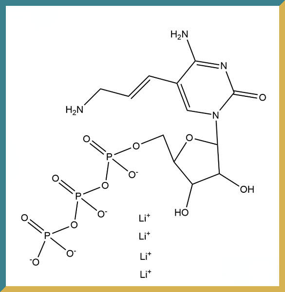 Aminoallyl-CTP(氨基烯丙基-CTP)是一种经化学修饰的核苷酸,其结构在胞苷三磷酸(CTP)的碱基上引入了一个氨基烯丙基(-CH2-CH=CH-NH2)侧链。