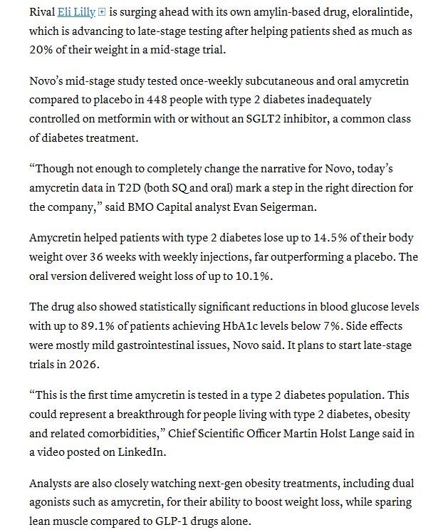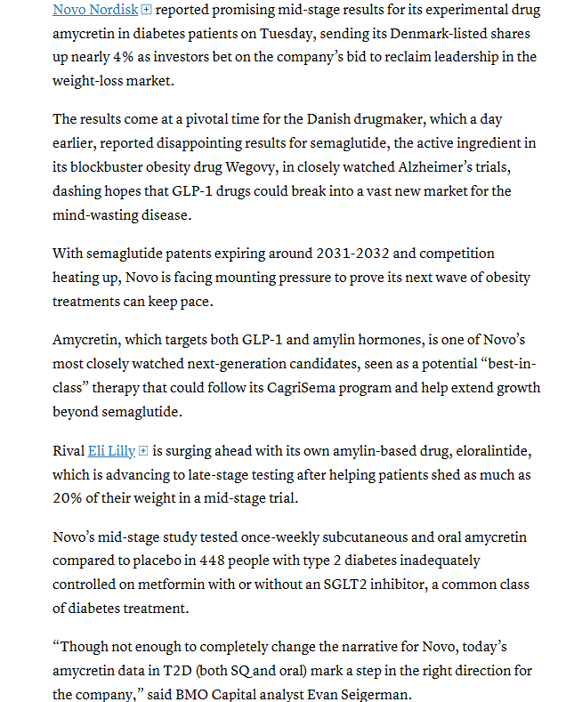 诺和诺德(Novo Nordisk)最新2期临床数据显示,单分子GLP-1 + 胰淀素(amylin)双重激动剂Amycretin在肥胖和2型糖尿病患者中显示出积极疗效。