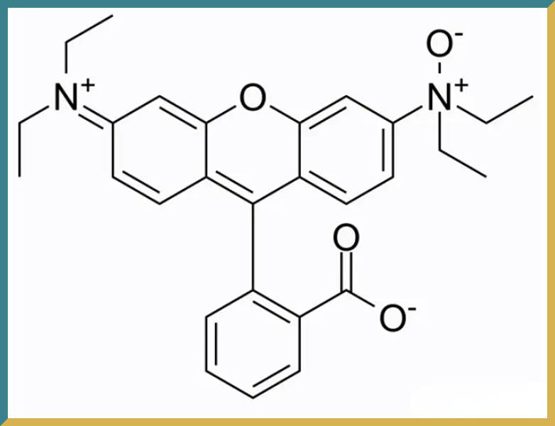 结构特点:以 rhodamine B 为荧光骨架,含 N-氧化物(N-oxide)侧链;在未结合 Fe²⁺时呈闭环、非荧光状态;Fe²⁺触发 N-oxide 还原,导致环张开,产生强橙/红荧光。