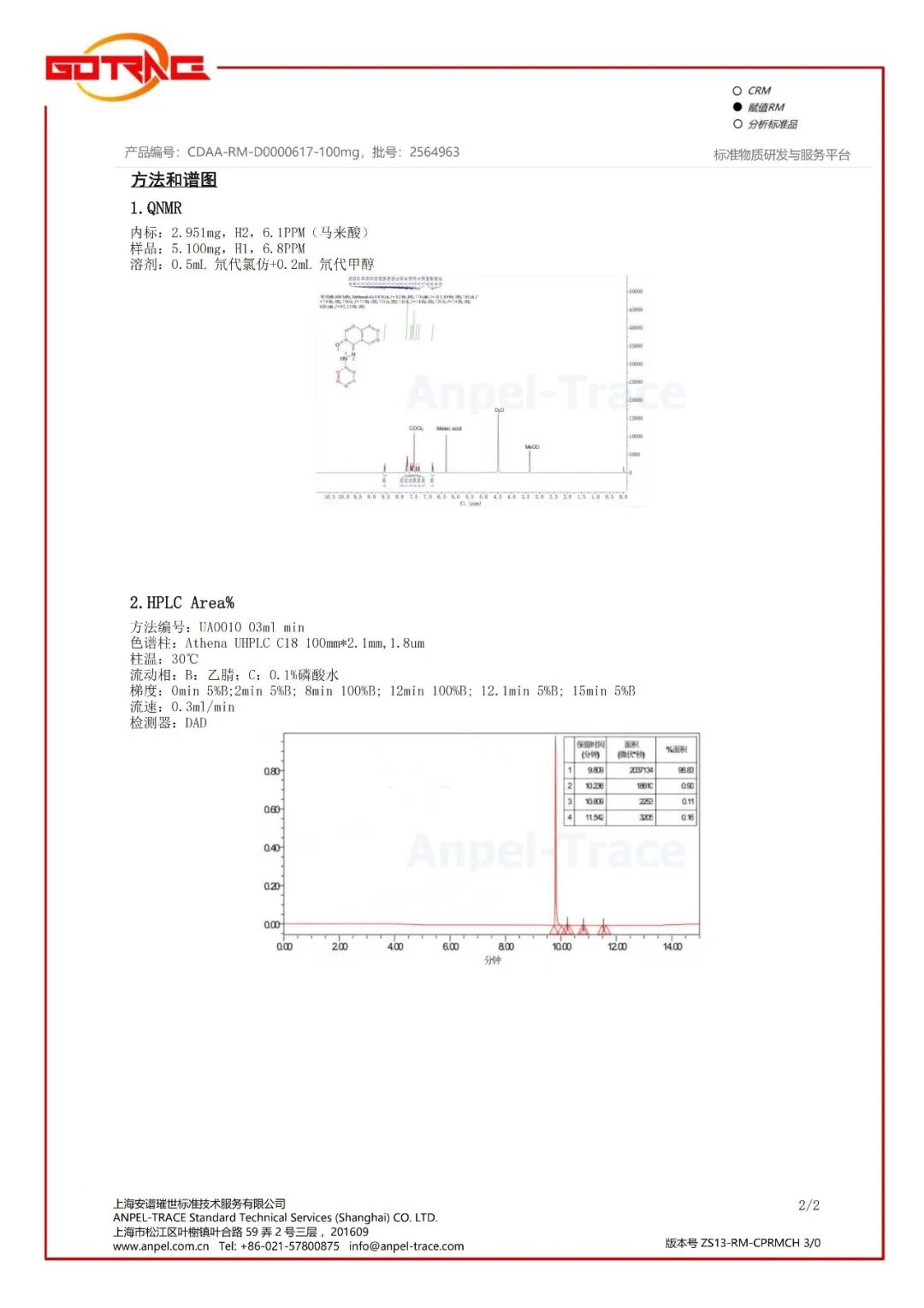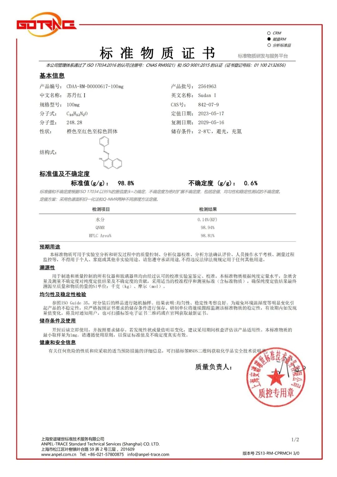 苏丹红Ⅰ--货号:CDAA-RM-D0000617-100mg、批次:2564963 证书如下图所示: