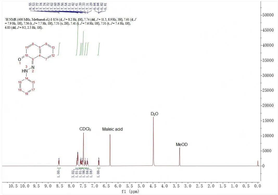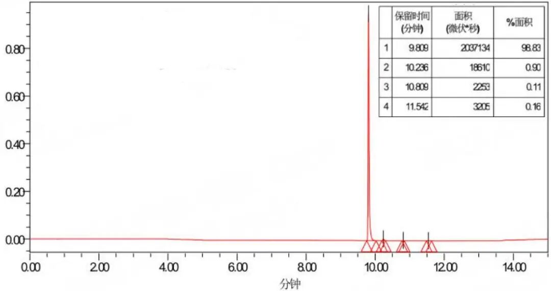 以CDAA-RM-D0000617-100mg,苏丹红Ⅰ为例,RM级别产品采用液相色谱法和QNMR双法定值确定产品的特性量值,产品具有特性量值更准确、稳定性更高等优点。该产品检测谱图如下:
