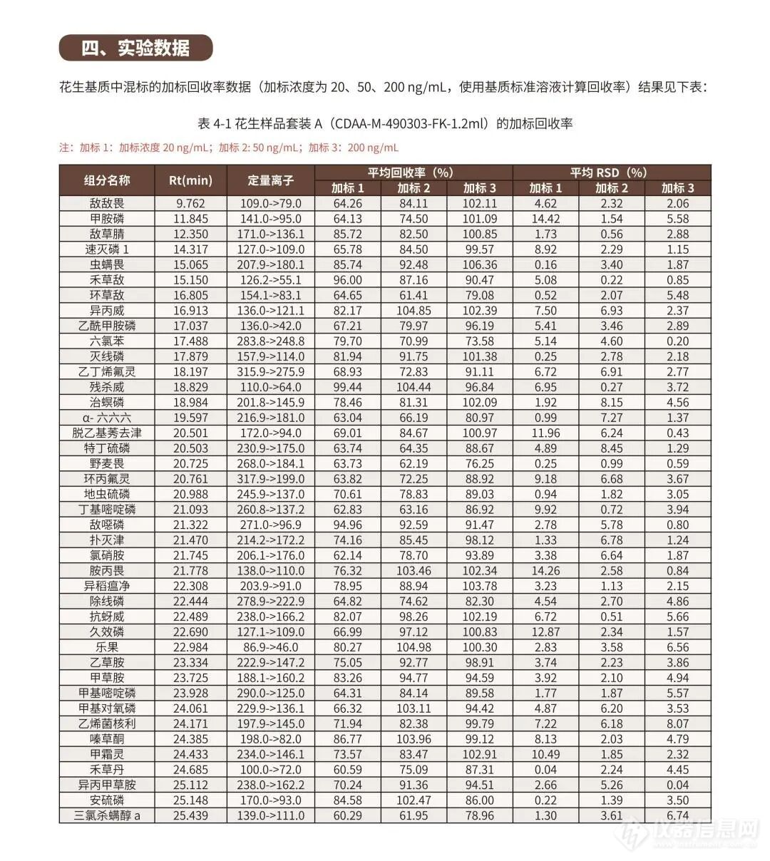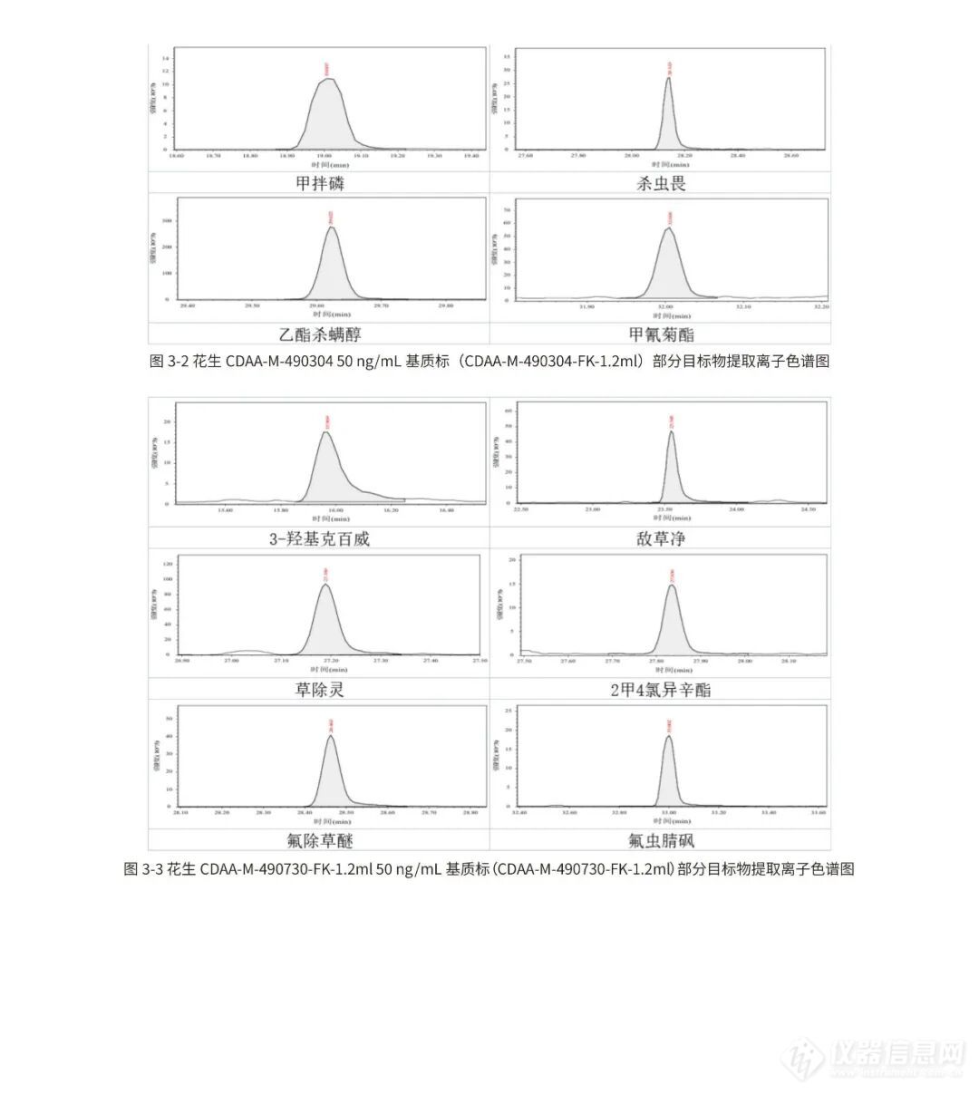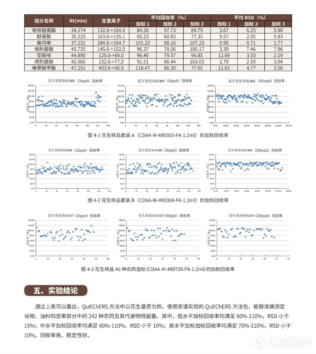 面对新标准的实施,安谱实验依旧保持高度关注,继菠菜基质后针对蔬⾕物、油料和坚果部分(花生)也严格参照GB 23200.113-2026标准采用QuEChERS法进行了全面验证,实验结果表明花生基质在低、中、高浓度下回收率60-120%,满足标准检测要求。