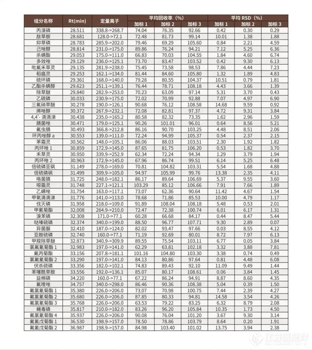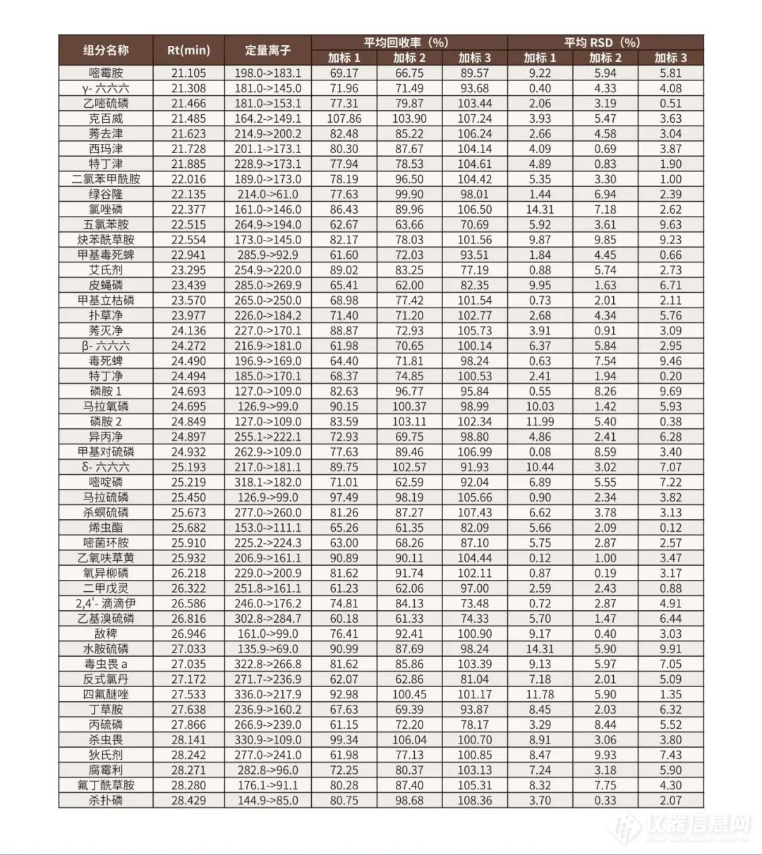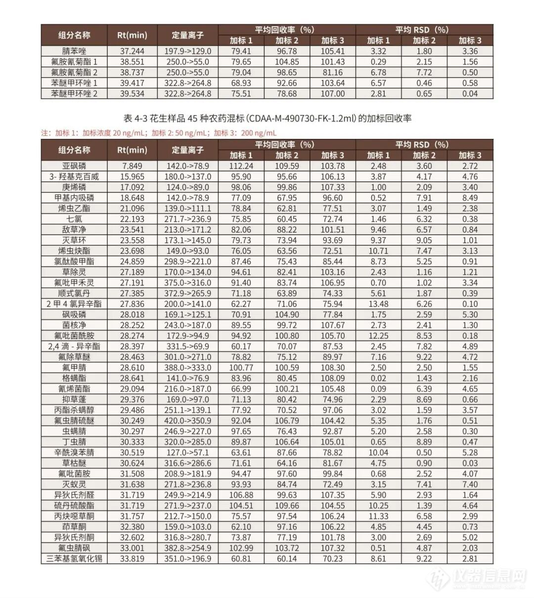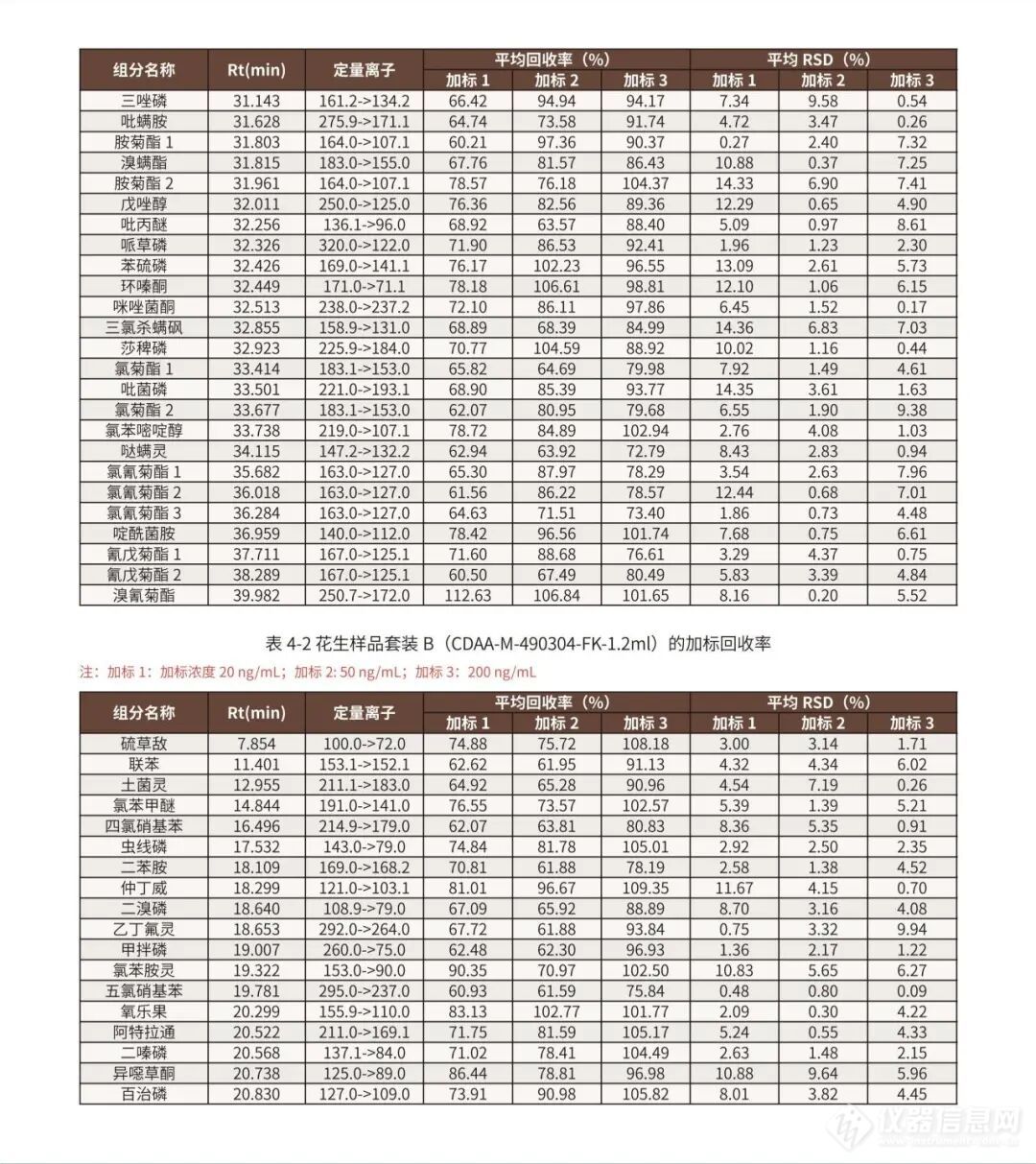 面对新标准的实施,安谱实验依旧保持高度关注,继菠菜基质后针对蔬⾕物、油料和坚果部分(花生)也严格参照GB 23200.113-2026标准采用QuEChERS法进行了全面验证,实验结果表明花生基质在低、中、高浓度下回收率60-120%,满足标准检测要求。