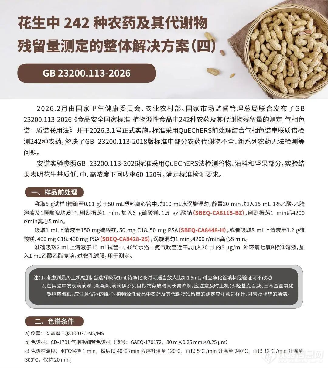 2026年3月1日,由国家卫生健康委员会、农业农村部、国家市场监督管理总局联合发布的7项食品安全国家标准正式落地实施!本次更新的标准矩阵中,GB 23200.113-2026《食品安全国家标准 植物源性食品中242种农药及其代谢物残留量的测定 气相色谱—质谱联用法》尤为引人关注,标准采用QuEChERS前处理结合气相色谱串联质谱检测242种农药,解决了GB 23200.113-2018版标准中部分农药代谢物不全、新系列农药无法检测等问题。