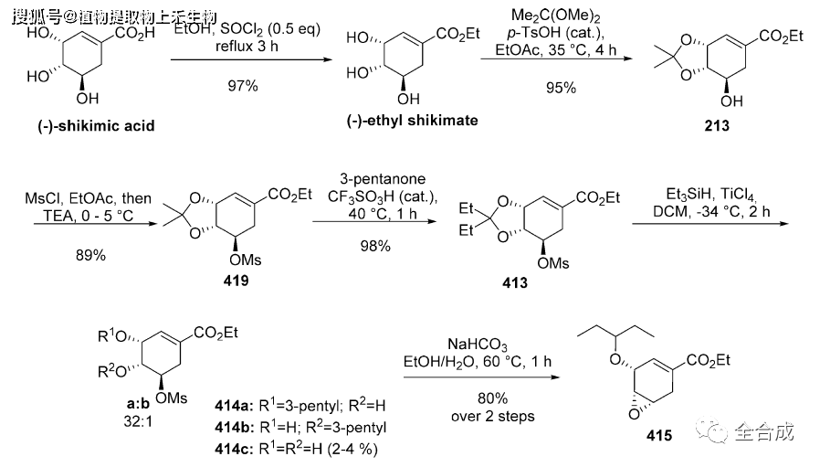 绕过中间体415的磷酸奥司他韦的合成路线: