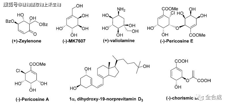 莽草酸因其广泛的天然来源和独特的手性构型,应用于许多天然产物和生物活性物质的合成(结构如上所示),本文将主要对莽草酸在磷酸奥司他韦合成中的应用作一简要介绍。
