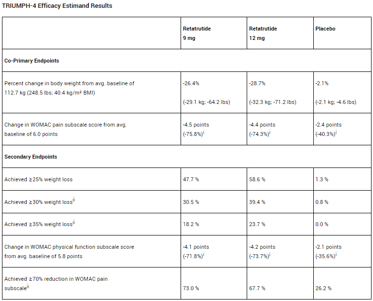 一项额外的事后分析结果表明,依据疗效估计量的观察数据,治疗68周时,接受9毫克 retatrutide治疗的患者中,14.1% 完全摆脱膝关节疼痛;接受12毫克 retatrutide治疗的患者中,这一比例为12.0%;而安慰剂组的这一比例仅为 4.2%。