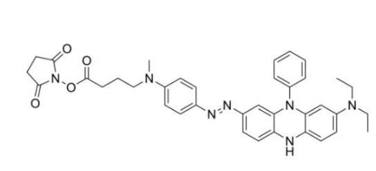 NHS酯基(琥珀酰亚胺酯)在pH 7-9条件下,与蛋白质(赖氨酸残基)、胺修饰寡核苷酸等含伯胺基团的分子发生亲核取代反应,形成稳定的酰胺键。UBQ-3 具有明亮荧光,激发和发射波长适合用于多通道荧光成像,信号清晰,背景低。偶联后的荧光标记通常对蛋白结构影响小,可保持生物分子活性。