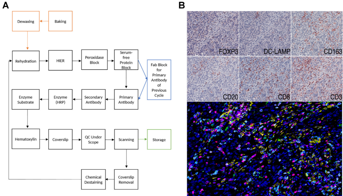 MICSSS 技术的核心是通过 “染色 — 扫描 — 脱染” 的循环步骤,在同一张组织切片上完成多个标志物的检测,它既和传统 IHC 技术兼容性强,又能实现多标志物同步检测,但缺点是操作流程比较繁琐,花费的时间也较长。图中清晰展示了 MICSSS 的完整实验步骤,同时呈现它在三阴乳腺癌组织中检测多种标志物的成像效果。子图 A详细列出了从染色到脱染的循环过程,包括 Fab 片段封闭、化学脱染这些关键步骤。子图 B既展示了 6 种标志物各自的染色图像,也呈现了这些图像融合后的复合伪彩图,单独染色的图像信号清晰、没有杂乱背景,复合图则能让人直观看到不同免疫细胞在肿瘤组织里的浸润情况,以及这些细胞之间的空间位置关系。MICSSS实验流程为后续研究者提供可重复的操作参考,同时也证明了这项技术能有效检测多标志物,还能和传统单一IHC 技术兼容。
