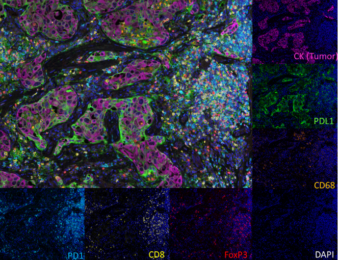 标准显色mIHC是传统单一IHC技术的延伸,通过不同颜色发色团标记多个标志物实现同张切片多标志物同步检测,适用于临床常规检测。本图展示了三重显色mIHC的成像效果、验证其多标志物共表达检测可行性及发色团区分度与染色清晰度。采用Ventana公司三种不同颜色的发色团标记,辅以苏木素复染区分细胞核与细胞形态,不同颜色对应三种标志物的表达位置,可通过颜色叠加观察标志物空间分布差异及共表达信号,直观体现其多标志物检测能力。这一图像验证了多重显色mIHC的实用性,展示了所选发色团组合的有效性,为临床病理学家熟悉的光学显微镜解读方式提供适配性,同时为后续多标志物显色mIHC的优化提供了可直接应用于临床的参考依据。