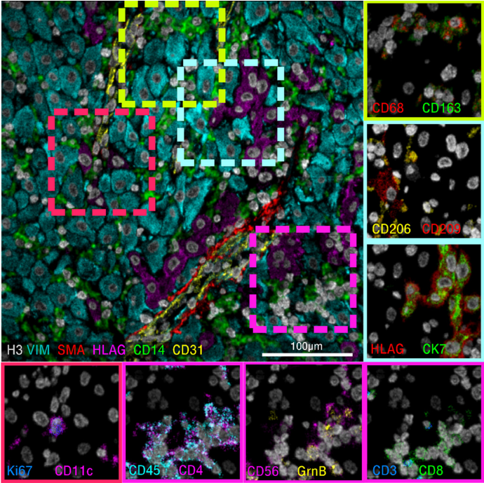 EMS-IHC通过一抗与元素质量标签结合,利用质谱仪实现像素级电离分析,可同时检测数十个标志物、干扰少,适合复杂肿瘤微环境高维度解析。本图展示了其成像效果,验证其在人蜕膜组织中多标志物同步检测、高分辨率空间分布分析的能力。实验采用MIBI-TOF技术检测人蜕膜组织,应用40标志物检测面板,展示6种标志物的成像结果,包含6色叠加主图和双色放大插图。主图展示了标志物整体空间分布,插图呈现共定位关系,灰度图像素强度对应标志物表达丰度,可实现精准定量且成像分辨率高。这一图像凸显了EMS-IHC的高分辨率空间分析能力,为复杂组织微环境细胞异质性分析提供工具,同时拓展了该技术的应用场景,可用于非肿瘤组织免疫相关疾病机制探索。