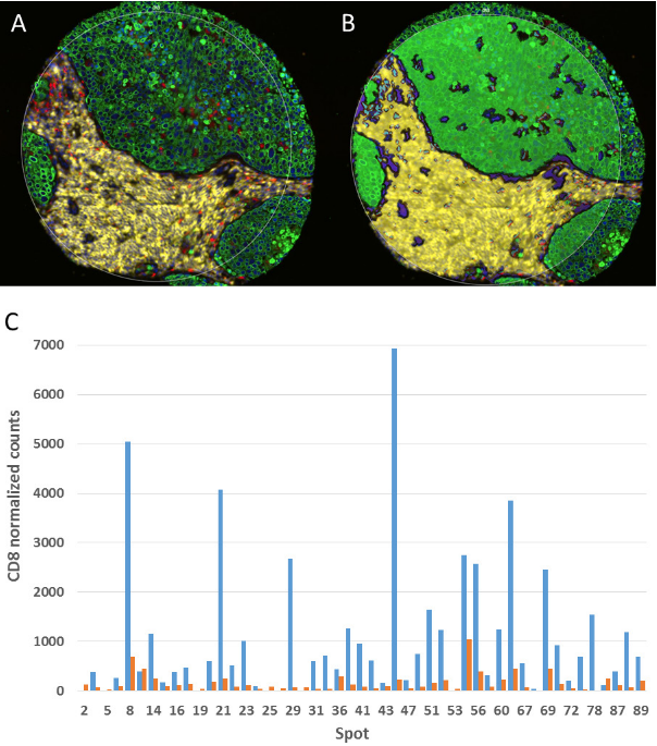 DSP技术通过UV可切割荧光DNA标签一抗结合NanoString技术,实现特定组织分区多标志物精准定量,无需迭代染色、无自发荧光干扰,适合临床样本特定区域分析。实验验证了其在非小细胞肺癌TMA中特定区域标志物定量分析的可行性与准确性,该图清晰呈现了荧光标记定义组织分区、UV激光切割标签、NanoString计数的关键流程,CD8标志物分区定量结果符合已知生物学特征,验证了定量准确性。DSP技术的核心优势在于解决了传统技术无法精准定位定量的局限,验证了其定量可靠性,同时展示了其在TMA高通量检测中的应用潜力,适合多中心临床研究及精准免疫治疗标志物筛选。
