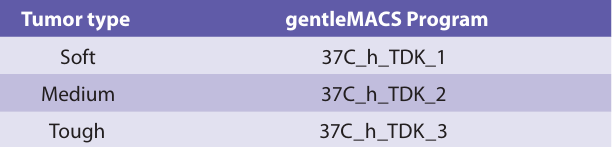 (1)若使用带加热功能的 gentleMACS™ Octo 解离仪器,根据下表选择适宜程序,运行结束后可直接按说明书操作进行下一步。