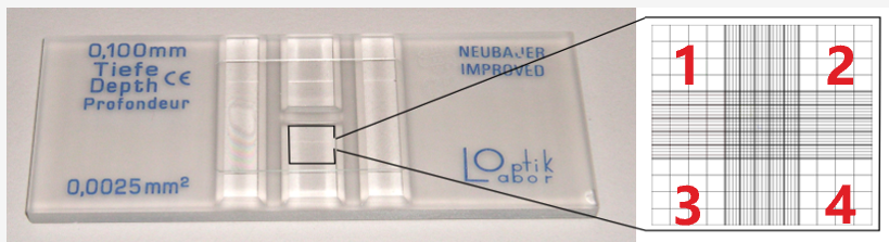 - 显微镜观察,计数四角方格的细胞,遵循“计上不计下、计左不计右”原则