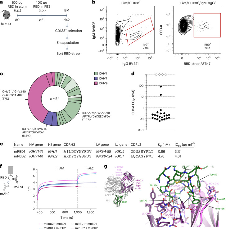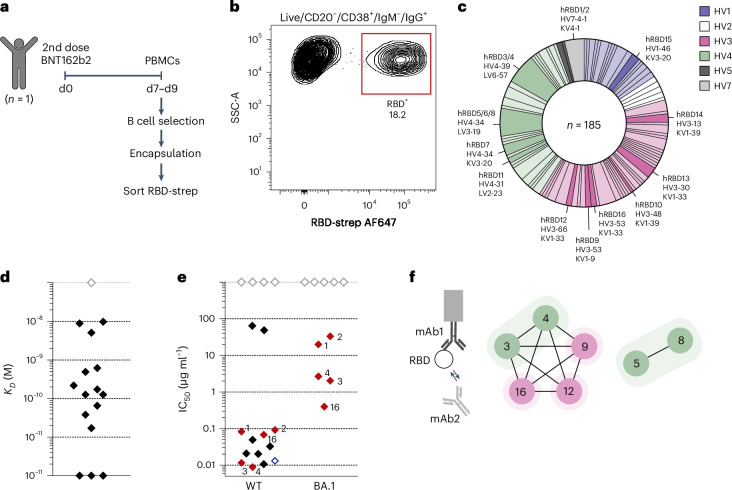 从单个志愿者中获得了185个浆母细胞序列,涵盖156个不同的VH序列和111个VH克隆型。与小鼠实验类似,也观察到显著扩增的克隆型,如IGHV4-34克隆(占比5.4%)。通过重组表达16个代表性抗体,94%(15/16)显示RBD结合活性,其中80%(12/15)具有中和野生型SARS-CoV-2的能力。最有效的中和抗体IC₅₀达到10-100 ng ml⁻¹,与临床使用的REGEN-COV抗体组合相当。