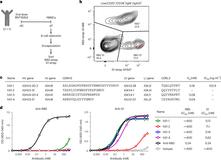 该技术的另一优势在于流式细胞术的多参数检测能力。研究人员通过同时使用荧光标记的S1和RBD抗原,成功筛选出结合S1但不结合RBD的抗体。从疫苗接种7天后的PBMCs中分选S1阳性/RBD阴性的ASCs,通过指数排序分析选择信号比最高的四个序列进行表达。
