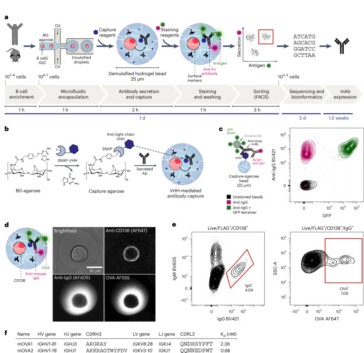 工作流程具体包括三个关键步骤:首先,将B细胞与苯甲基鸟嘌呤(BG)修饰的琼脂糖混合,通过微流控技术封装成直径25μm的单分散水包油液滴,形成稳定的水凝胶微环境。BG基团可与SNAP-tag发生特异性共价反应,研究人员通过表达抗轻链恒定区的VHHs-SNAP融合蛋白,构建了抗体捕获基质。这种设计使得分泌的抗体能被特异性地固定在水凝胶中,同时保持其抗原结合能力。