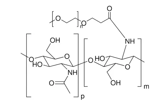 mPEG-Chitosan的分子设计巧妙结合了天然多糖的生物活性与合成聚合物的可调性。壳聚糖由β-(1→4)-D-葡萄糖胺和N-乙酰-D-葡萄糖胺组成,其分子链上丰富的氨基(-NH₂)和羟基(-OH)赋予其阳离子性、可生物降解性及抗菌性,但同时也导致其在中性生理环境中溶解性差、易被免疫系统快速清除。通过酰胺键、醚键或氨基甲酸酯键将mPEG接枝至壳聚糖主链后,材料表面形成致密的“水化层”,既保留了壳聚糖的生物活性位点(如氨基),又通过PEG的“隐形”效应屏蔽了正电荷,显著提升了材料的生物相容性。