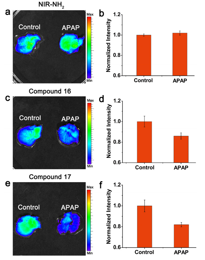 高稳属性拉满:具备优异的光稳定性与化学稳定性,可耐受复杂反应体系,储存方便且不易降解。 极高的修饰灵活性:固体形态适配多种合成场景,氨基基团可灵活进行各类修饰(如NIR-ONOO⁻、NIR-LAP 等),轻松适配不同靶点、不同疾病模型的探针设计需求。 精研工艺 + 高产率:专属合成工艺保障产品批次稳定性,产率优势显著,降低大规模探针制备的成本与时间成本。 肝诊疗精准适配:其衍生探针可成功应用于APAP诱导肝损伤等模型的体内外成像,在肝脏疾病精准生物诊疗领域潜力巨大。 图1 (a, c, e) BALB/c小鼠的代表性肝脏成像图:小鼠先经腹腔注射生理盐水(对照组)或 300 mg/kg 剂量的对乙酰氨基酚(APAP),随后分别经静脉注射 (a) NIR-NH₂(60 μL, 100 μM)、(c) 化合物 16(60 μL, 100 μM)或 (e) 化合物 17(60 μL, 100 μM)。(b, d, f) 分别对应 (a, c, e) 组的相对荧光强度。 - 近红外荧光探针开发研究者(探针合成、修饰、优化); - 肝脏疾病(肝损伤、肝癌等)生物诊疗团队; - 分子生物学、生物化学、临床医学相关研究人员; - 需要高稳定性近红外染料进行对比实验、平台搭建的实验室。 百灵威稳定供应由南华大学附属南华医院程丹研究员研发的氨基长沙染料NIR-NH₂。 参考文献:De novo design of chemical stability near-infrared molecular probes for high-fidelity hepatotoxicity evaluation in vivo.