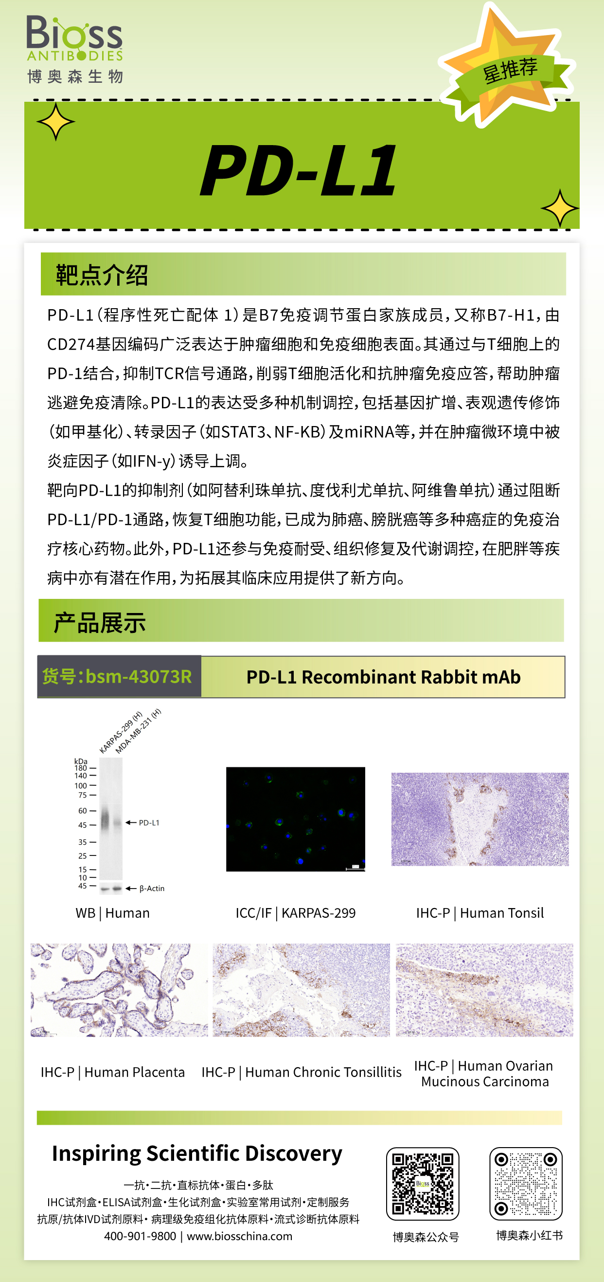 PD-L1(程序性死亡配体 1)是B7免疫调节蛋白家族成员,又称B7-H1,由CD274基因编码广泛表达于肿瘤细胞和免疫细胞表面。其通过与T细胞上的PD-1结合,抑制TCR信号通路,削弱T细胞活化和抗肿瘤免疫应答,帮助肿瘤逃避免疫清除。PD-L1的表达受多种机制调控,包括基因扩增、表观遗传修饰(如甲基化)、转录因子(如STAT3、NF-KB)及miRNA等,并在肿瘤微环境中被炎症因子(如IFN-y)诱导上调。