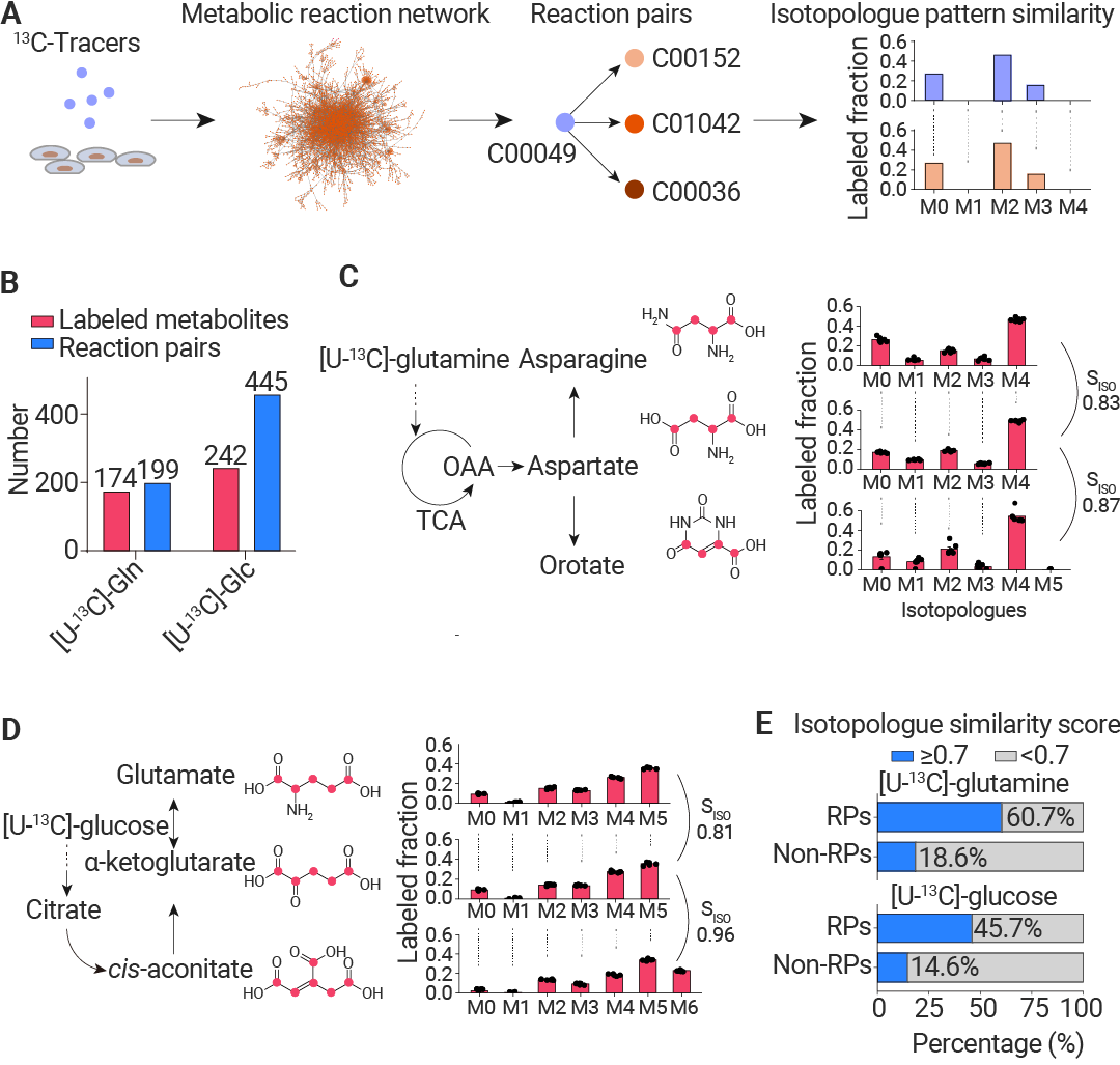 研究发现,在稳定同位素示踪实验中,具有直接生化转化关系的底物与产物,其同位素异构体分布模式 (isotopologue patterns) 高度相似。基于此,团队开发了同位素模式相似性评分 (SISO score),并以此构建代谢物间的关联网络,从而在全代谢组层面无偏倚地推断潜在代谢反应。