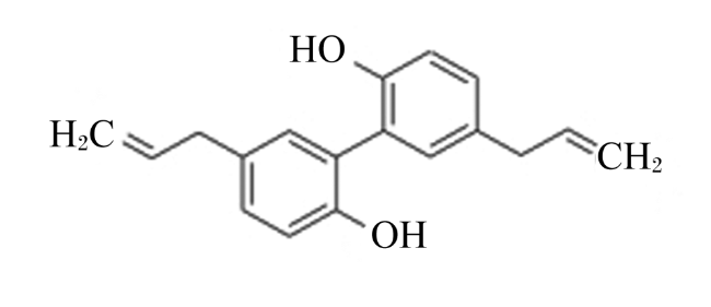 厚朴酚是植物木兰科、厚朴属厚朴中的一种成分,木脂素类植物多酚(结构式见图1)。厚朴的主要活性成分其分子式为C18H18O2,化学名为5',5-二烯丙基-2,2'-联苯二酚。单体为无色针状结晶,溶于氯仿、乙醚和丙酮等有机溶剂,难溶于水,酚羟基和烯丙基是其主要功能基团。厚朴酚具有较好的热稳定性,可在25 ℃环境下存放47 d,80 ℃以下降解较慢,100 ℃时半衰期为70 h左右。