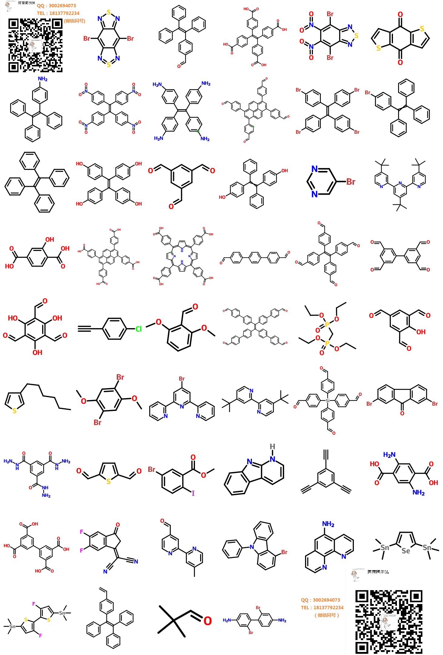 可接各种定制g/kg级定制~~COF、MOF单体系列,苯乙烯衍生物,OLED光电材料单体,PEG,液晶小分子等 QQ3002694073微信18137792234常年在线,订购产品提供图谱产品质量可靠,包装灵活,价格便宜,售后有保证,如遇任何质量问题,无条件退换货,科研高校先发货后付款温馨提示:所有供应产品仅用于科研!!!