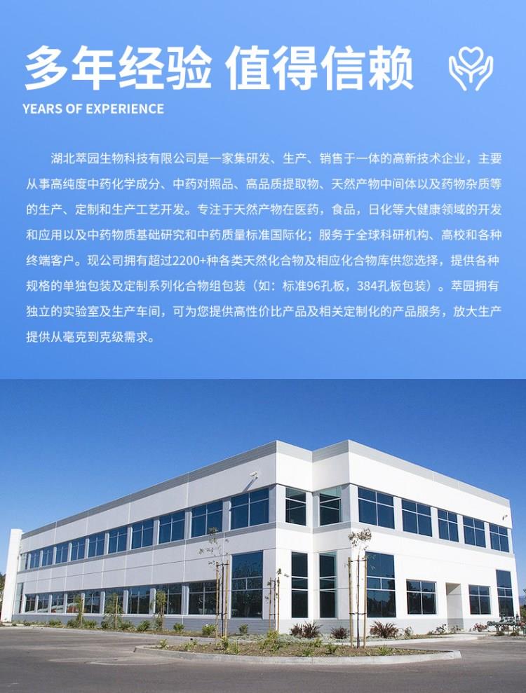 湖北萃园生物科技有限公司是一家集研发、生产、销售于一体的国际性高技术企业,主要从事高纯度中药化学成分、中药对照品、高品质提取物、天然产物中间体以及药物杂质等的生产、定制和生产工艺开发。专注于天然产物在医药,食品,日化等大健康领域的开发和应用以及中药物质基础研究和中药质量标准国际化;服务于全球科研机构、高校和各种终端客户。