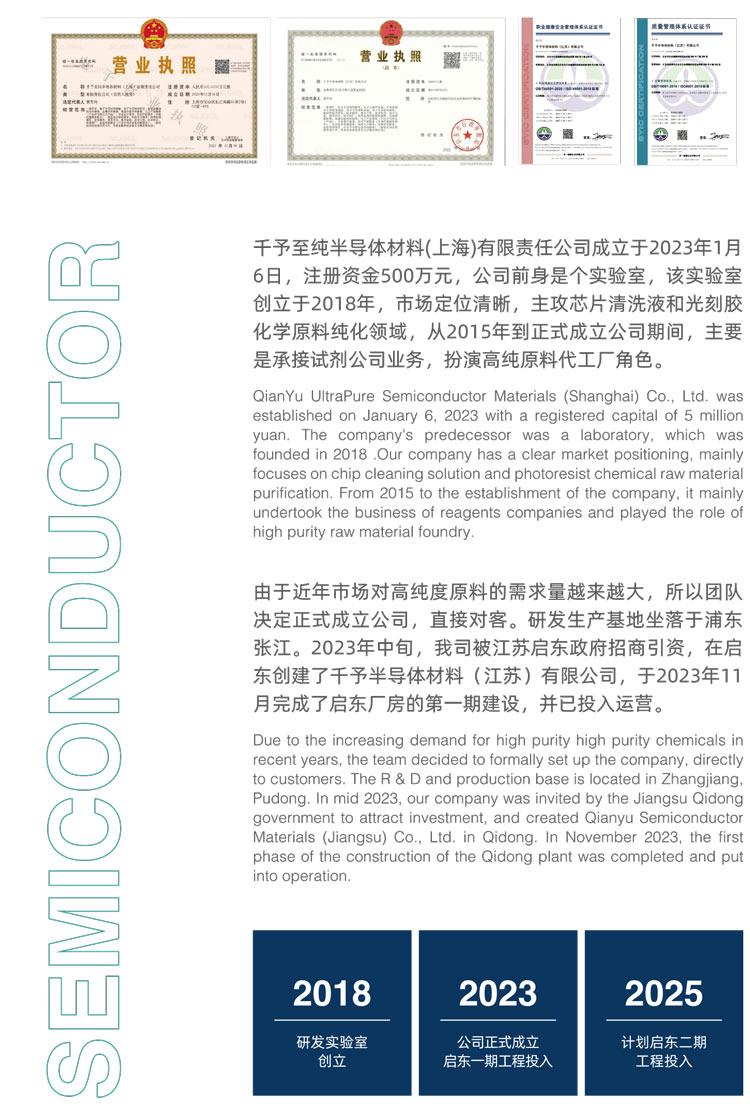 千予半导体材料(苏州)有限公司, 电子级化学品供应商,专注PPb级高纯电子化学品研发生产,金属离子控制≤20PPb/≤50PPb/100PPb等多种不同规格,晶圆清洗剂, 光刻胶添加剂,, 国产半导体材料, 蚀刻液原料, 半导体螯合剂