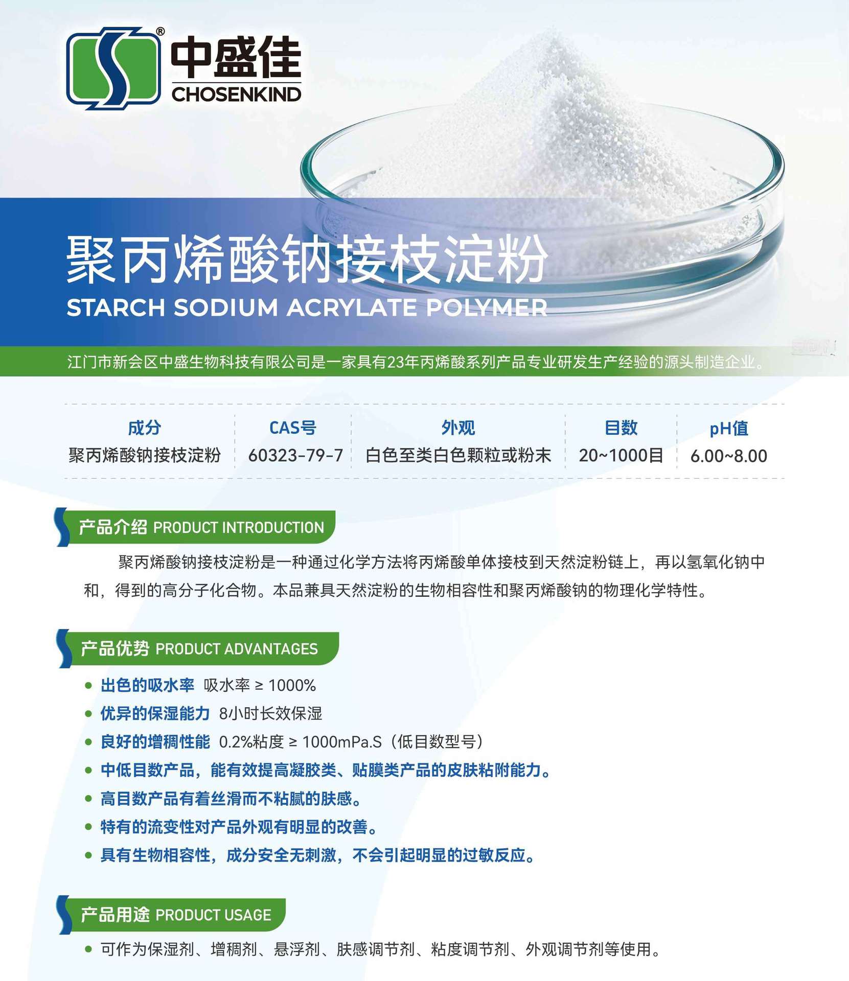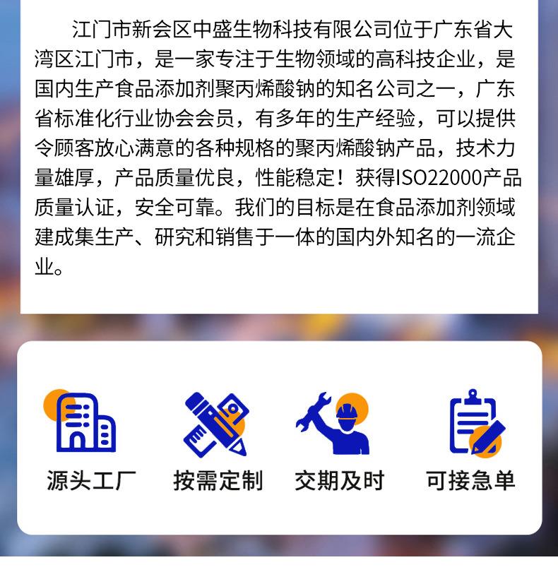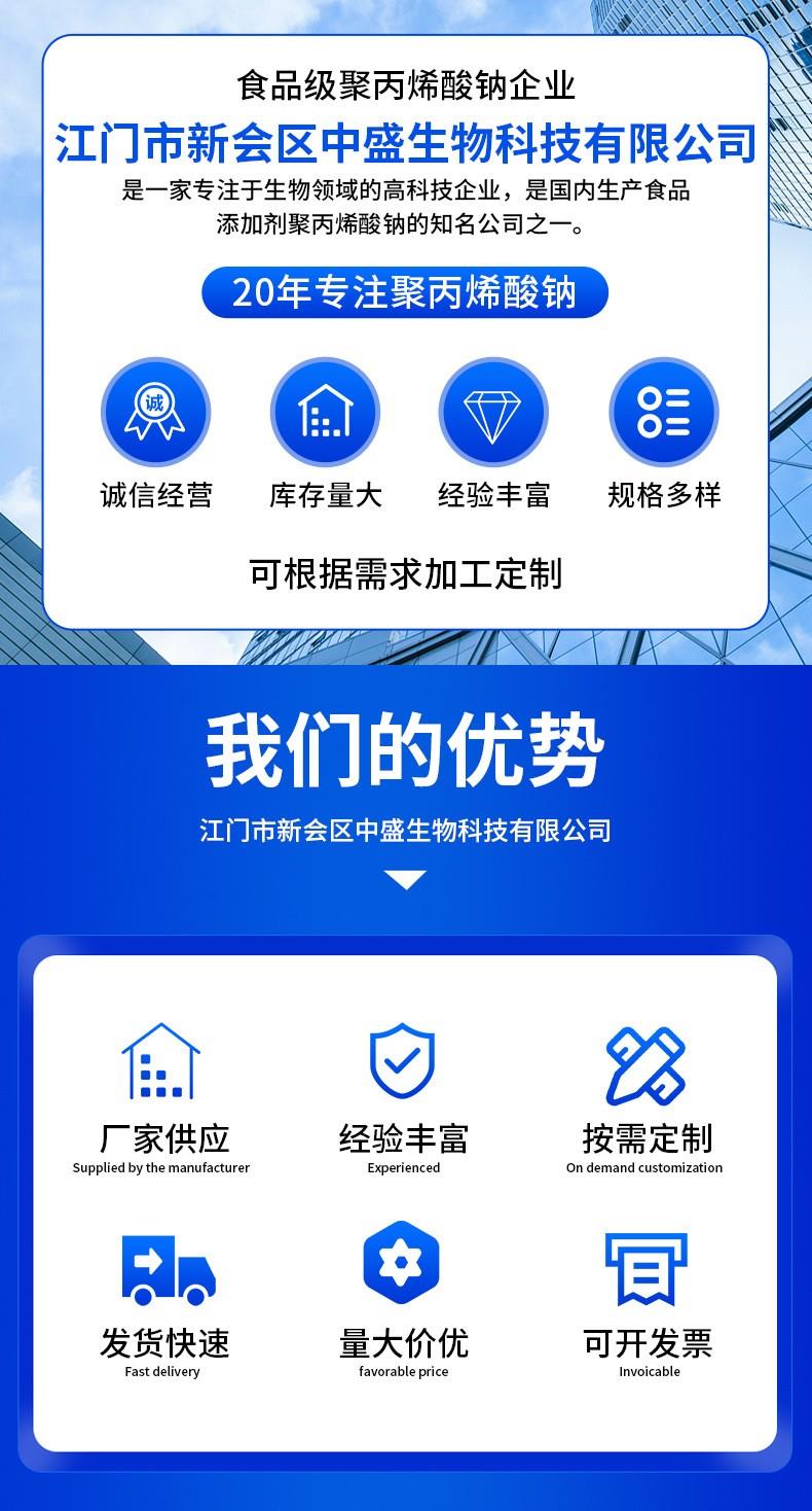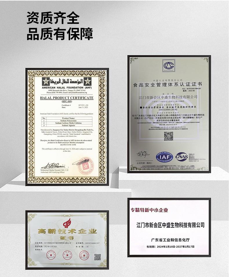 江门市新会区中盛生物科技公司位于珠三角大湾区,成立于2007年,拥有高级工程师,中级工程师及本科学历技术人员多名,是国内主要的食品级聚丙烯酸钠、中等分子量聚丙烯酸溶液以及丙烯酸共聚物生产厂家。先后取得食品级SC证书,ISO22000,HALAL认证,获得约二十项发明及实用新型专利,与“广东省食品药品学院"等建立校企合作关系。产品广泛用于食品,饲料添加剂,水处理剂,水凝胶贴、贴膏类、退热贴原材料等,多项产品美进口产品。